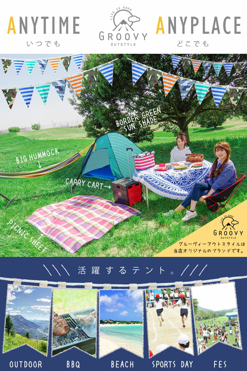 海水浴、ピクニック、バーベキュー、運動会などのイベントに最適! 収納袋から取り出すだけで、 あっという間にテントになります。