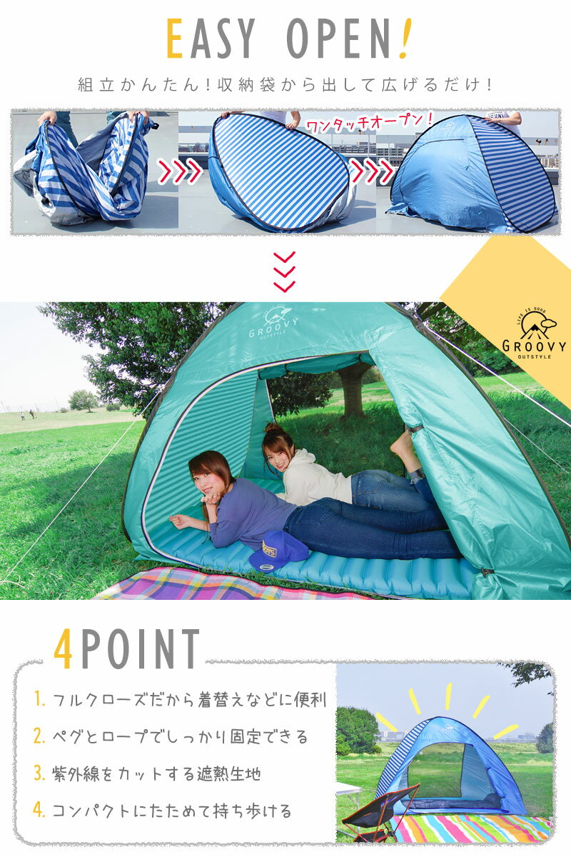 【マラソン限定タイムセール】 テント ワンタッチ ワンタッチテント 海 一人用 フルクローズ ポップアップテント サンシェード ビーチテント UVカット 大人2人用 遮光 シルバーコート 日よけ 着替え コンパクト収納 防災 簡単 かわいい Groovy 【送料無料】